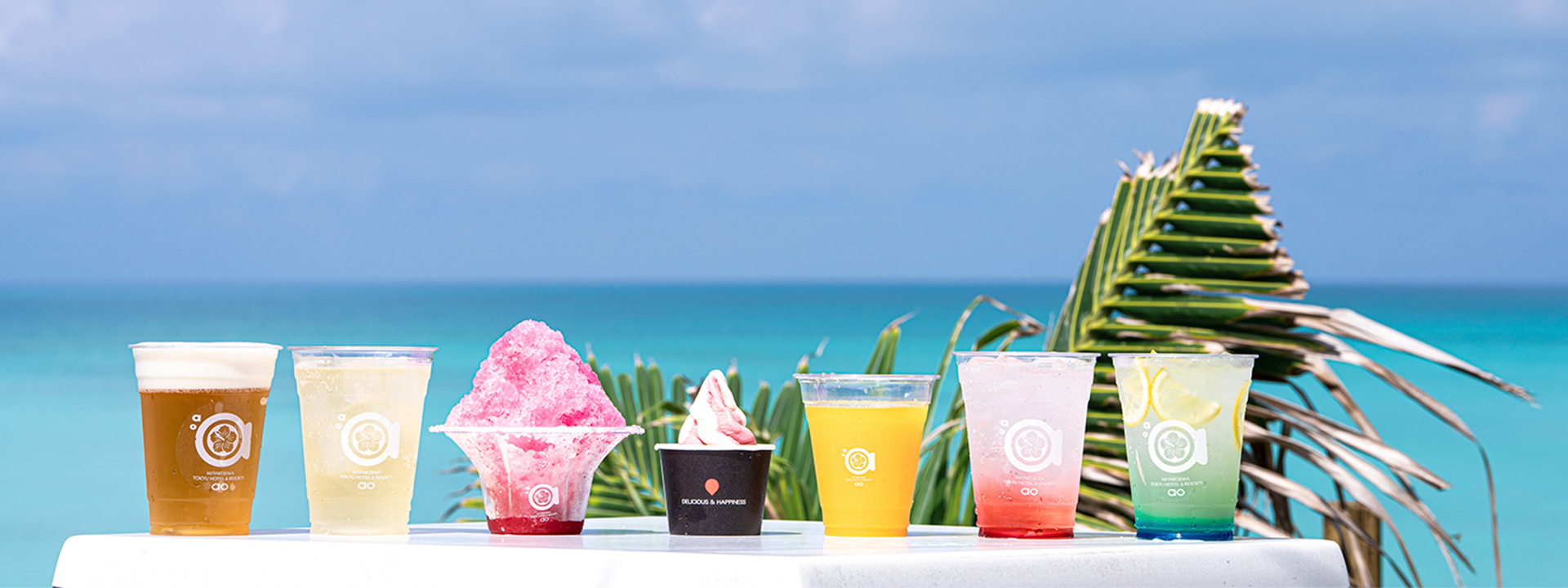 宮古ブルーの海に映えるカラフルなクリームソーダや宮古島産マンゴードリンク、ふわふわのかき氷、生ビール、ハイボールなどをご提供いたします。キッチンカー近くの木陰スペースのほか、プールやビーチ、てぃだテラスなどお好きな場所でお召し上がりください!