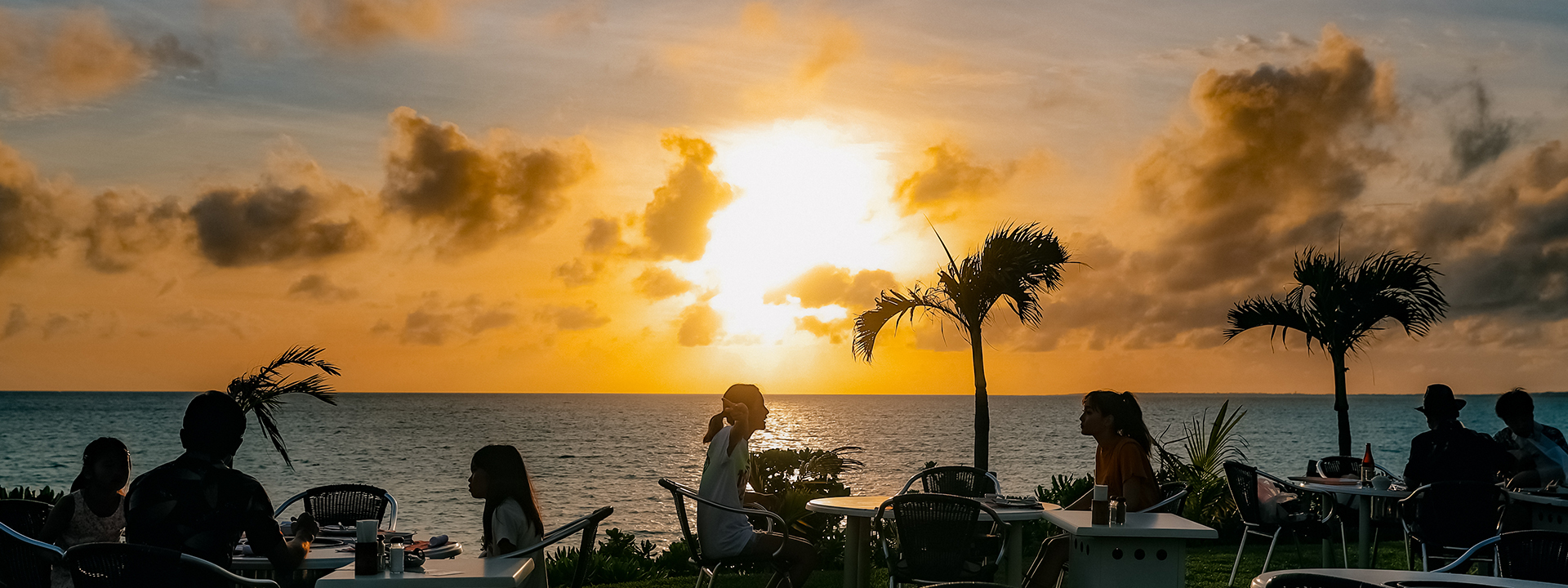 太陽の日差しも和らぎ水平線に傾く頃、黄金色に輝く海と、赤く染まった空を眺めながら楽しむ夕食。