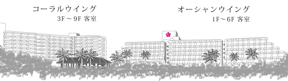 下記の「客室タイプ」リンクをクリックいただくと、ホテル外観図に各客室タイプの位置を色で表示いたします。