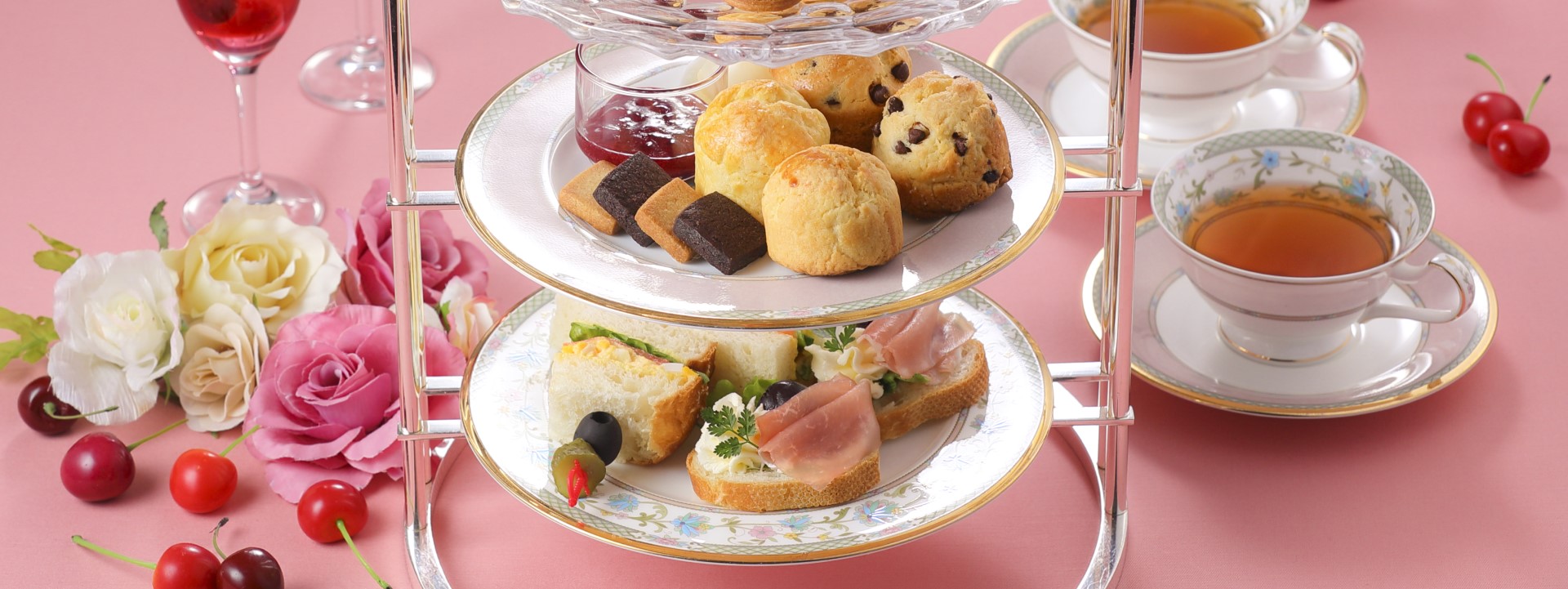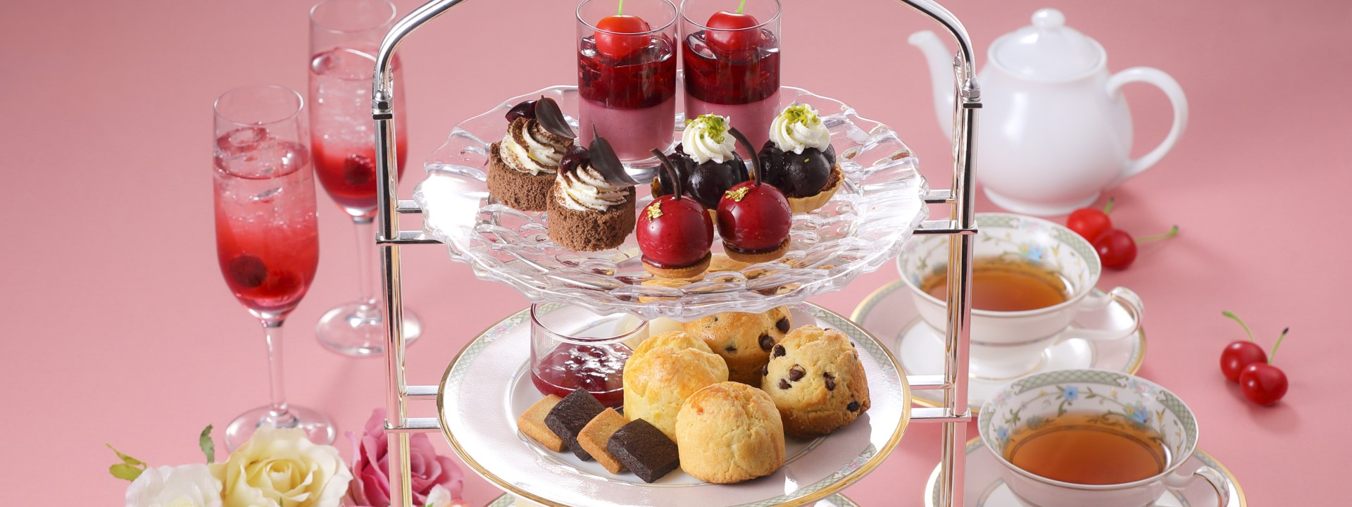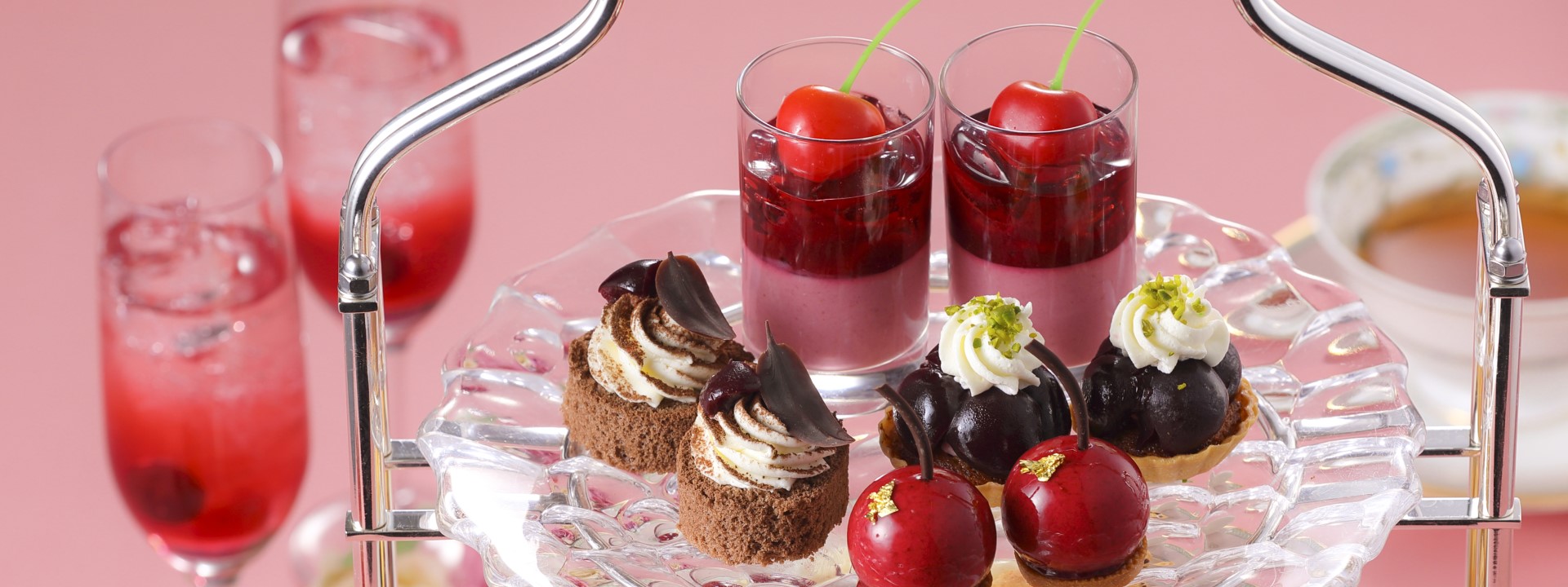 フランス語で黒い森を意味するチョコレートとサクランボシロップを使った伝統菓子「フォレ・ノワール」風のロールケーキや甘酸っぱさが口いっぱい広がるアメリカンチェリーのタルト。紅茶のラインナップにはバラやチェリーのフレーバーをご用意。