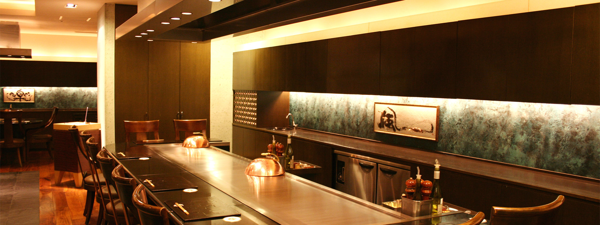 ライブ感あふれる鉄板焼は会話も弾むこと間違いなし。大切な記念日やお祝いの席など夜の愉しいひとときをお楽しみください。