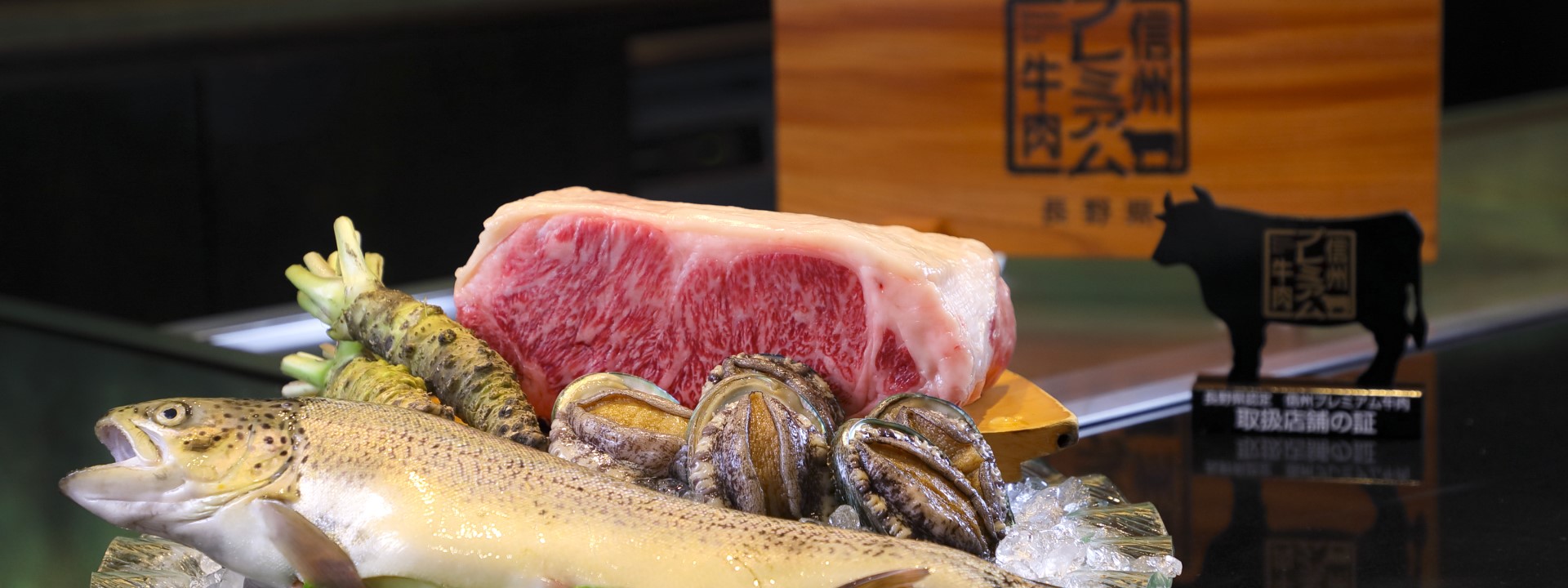 長野県が誇るプレミアム和牛や信州サーモンなど、上質な食材を選び抜いた贅沢な秋のコースです。