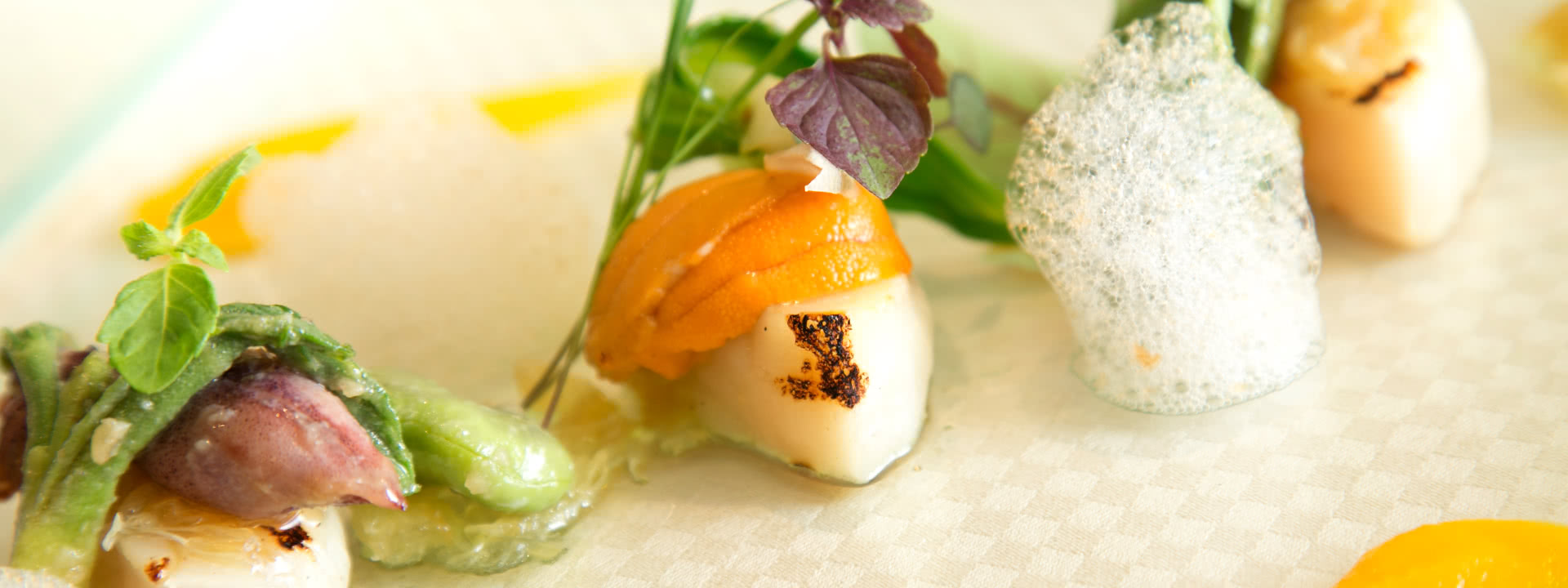 シマアジのマリネと帆立貝 焼き茄子とトマトのコンディメント添え シェリー酢のヴィネグレットとキャビア