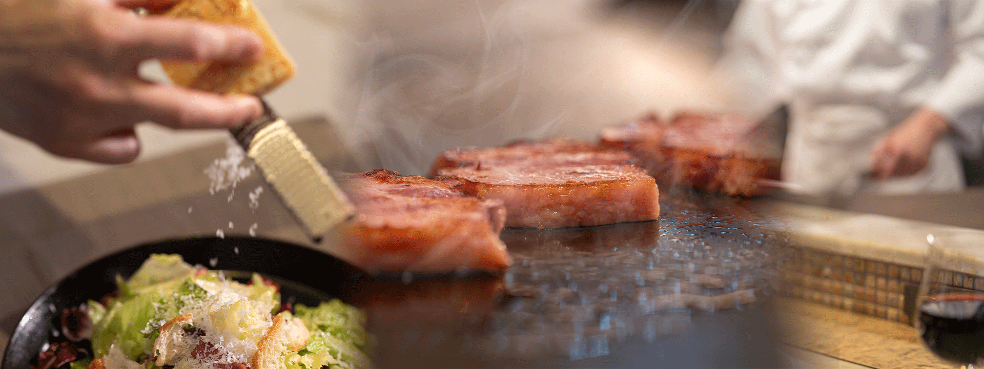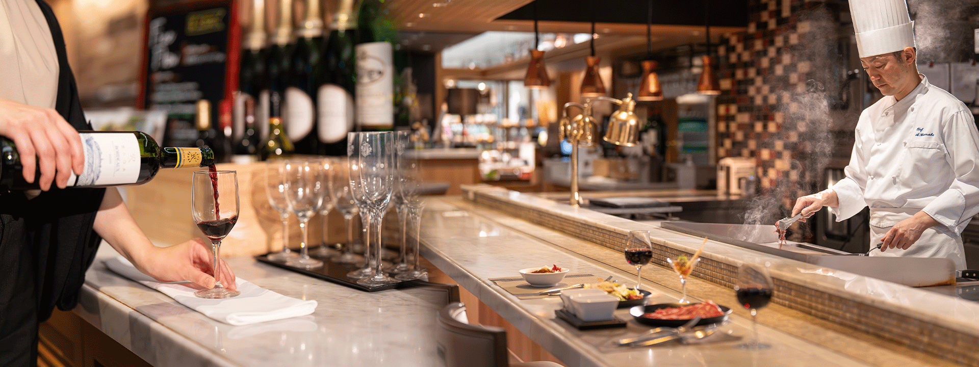 ホテルレストランのカウンターで味わう、焼きたての贅沢。目の前で焼かれる熱々の肉と、ソムリエ厳選ワインのフリーフロー。