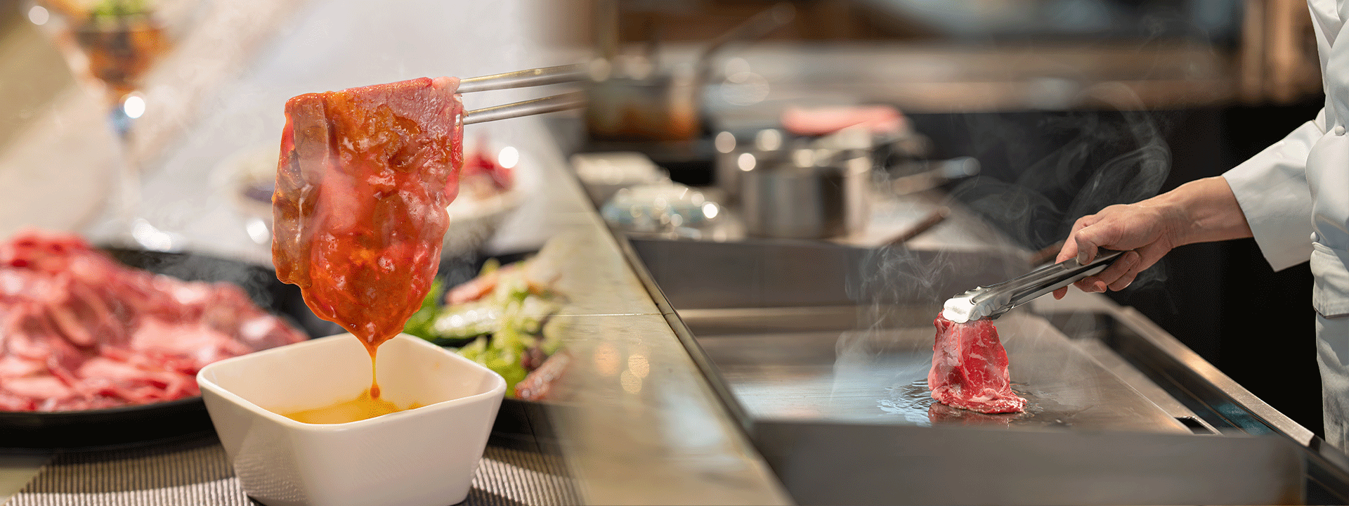 薄切りにした国産牛を目の前でシェフが香ばしく焼き上げます。熱々のお肉をお好きなだけお召し上がりください。
