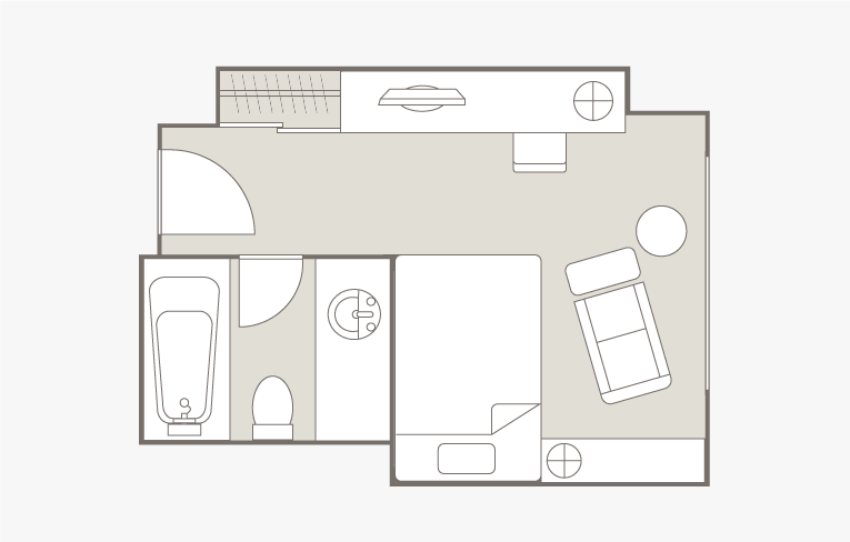 お部屋の間取りはあくまで一例です。面積や家具の配置、備品などはお部屋により異なりますので、あらかじめご了承ください。
