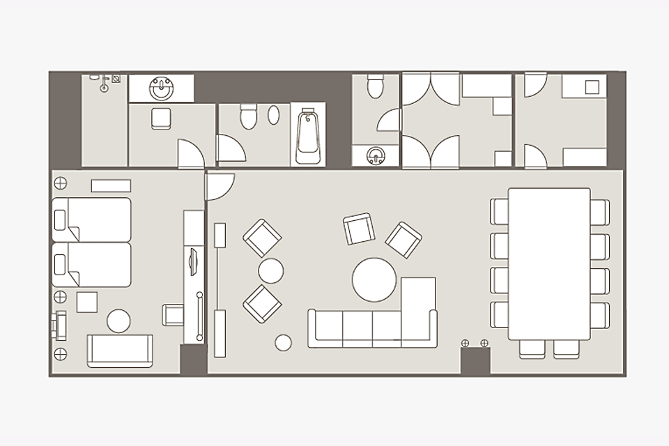 お部屋の間取りはあくまで一例です。面積や家具の配置、備品などはお部屋により異なりますので、あらかじめご了承ください。