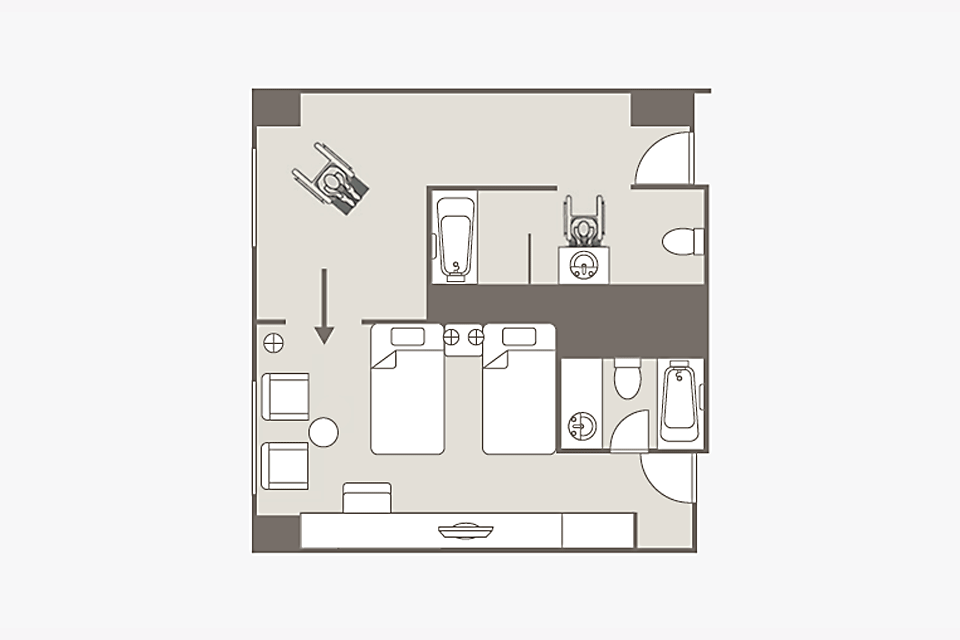 お部屋の間取りはあくまで一例です。面積や家具の配置、備品などはお部屋により異なりますので、あらかじめご了承ください。