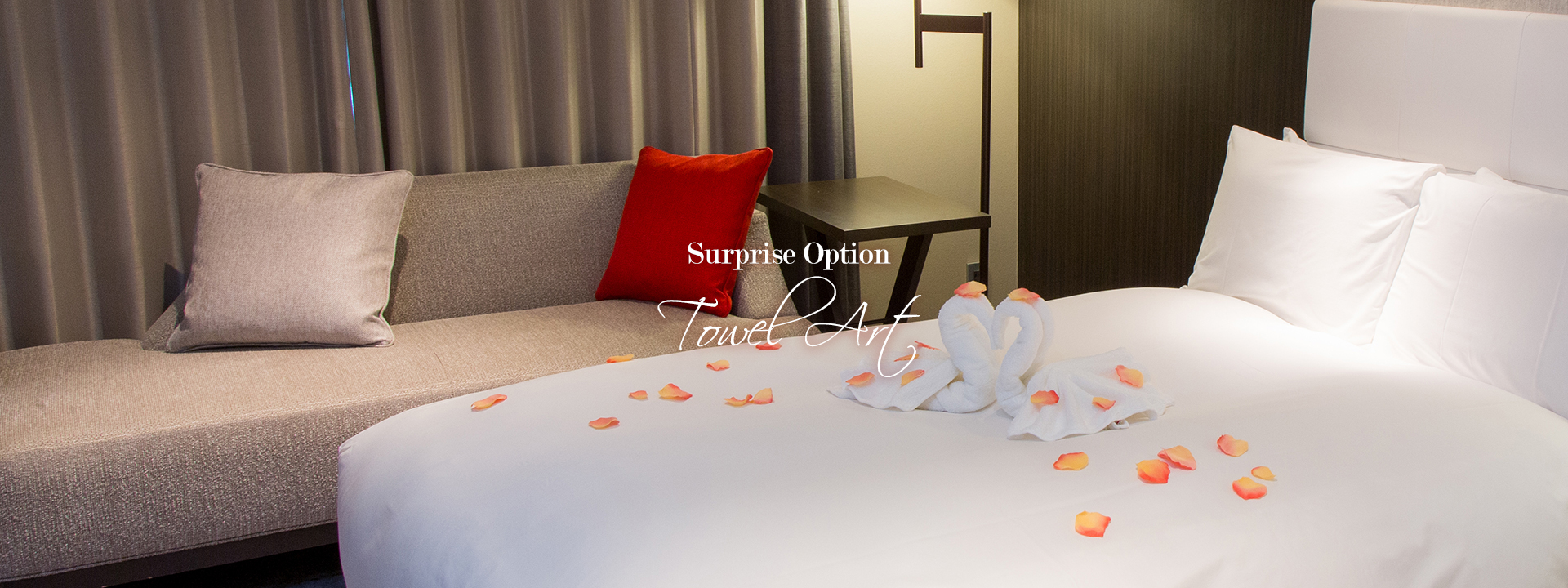 タオルで模ったスワンを2羽、ベッドの上にセッティングいたします。