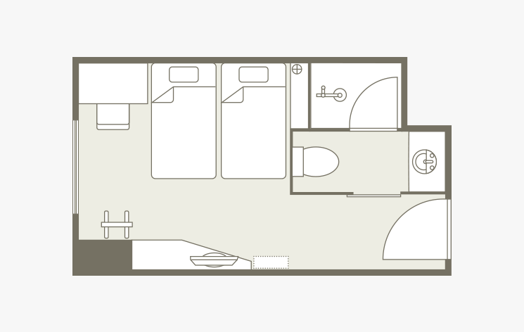 お部屋の間取りはあくまで一例です。面積や家具の配置、備品などはお部屋により異なりますので、あらかじめご了承ください。