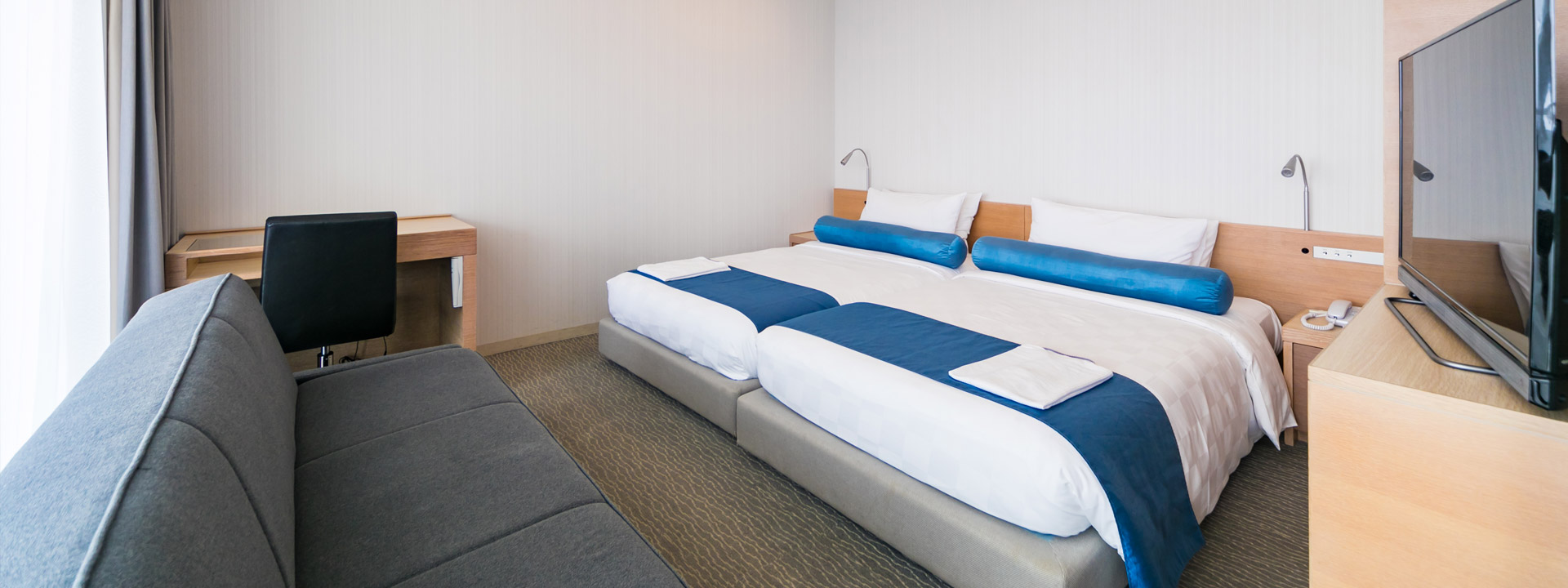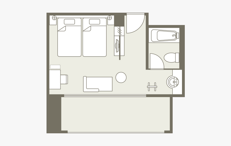お部屋の間取りはあくまで一例です。面積や家具の配置、備品などはお部屋により異なりますので、あらかじめご了承ください。