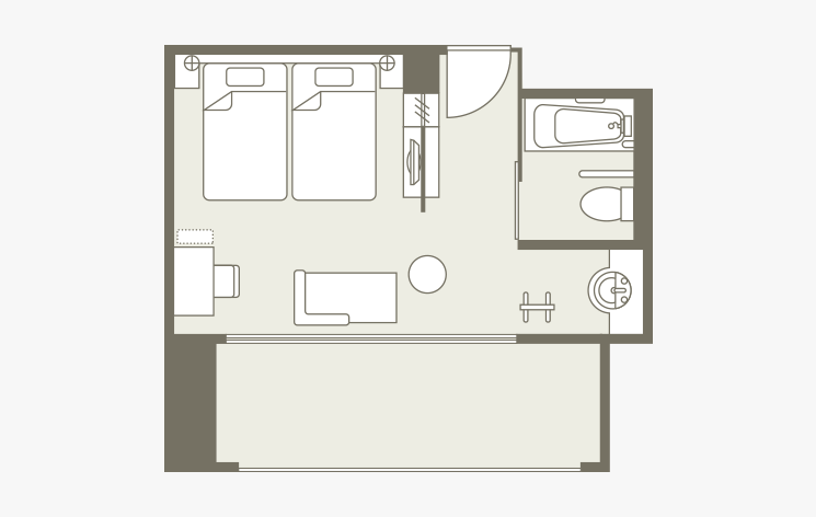 お部屋の間取りはあくまで一例です。面積や家具の配置、備品などはお部屋により異なりますので、あらかじめご了承ください。