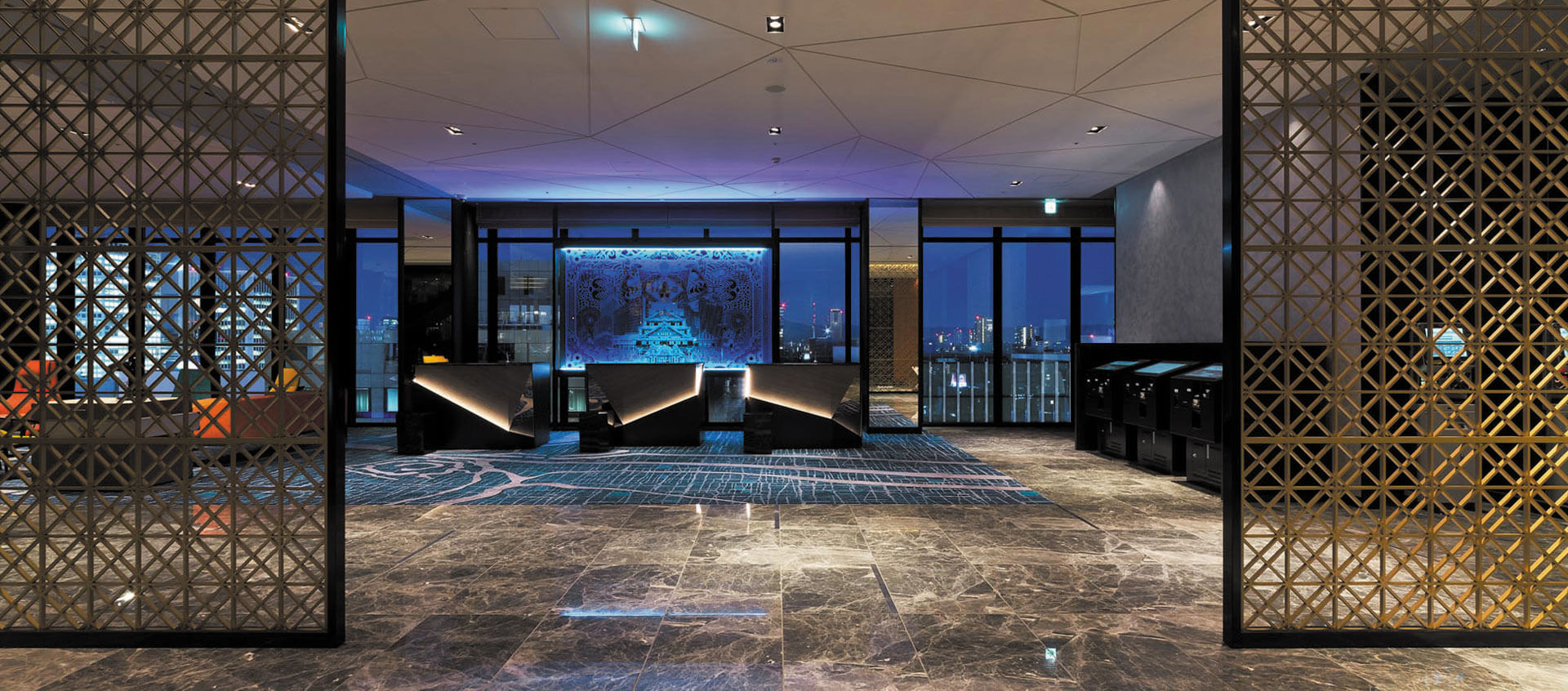 大阪の賑わいを思わせるビビッドなカラー、歴史に触れることのできるしつらい、万華鏡のきらめきを光と影で表現した照明。