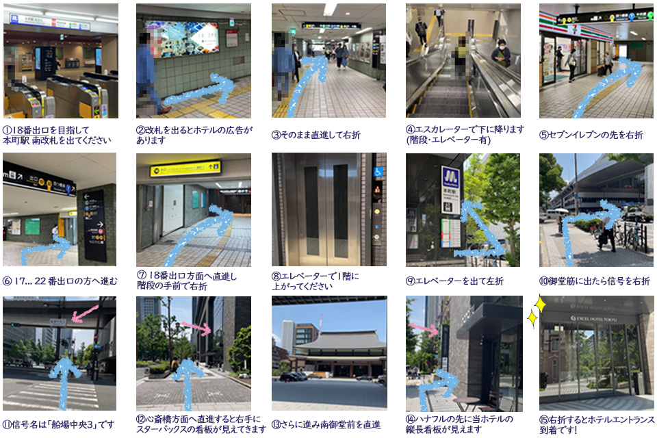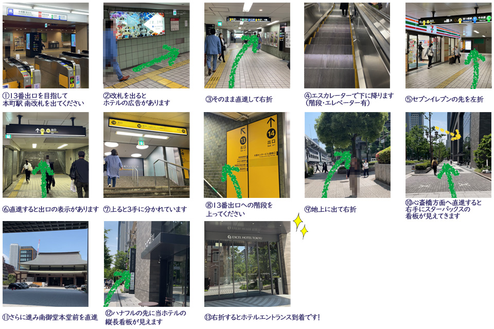地下鉄「本町駅」13番出口を出て「大阪御堂筋ビル」を右折し、御堂筋沿いを心斎橋方面に直進。「スターバックスコーヒー南御堂ビルディング店」・「南御堂山門」を越えて、「ハナフル」を過ぎた角を右折すると、ホテルエントランスです。
