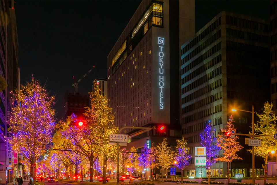 ホテル最上階・17階のレストランでは、御堂筋イルミネーションを眼下に眺めながら