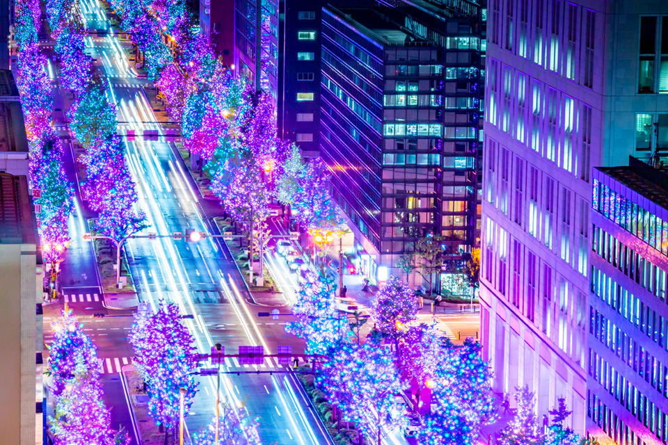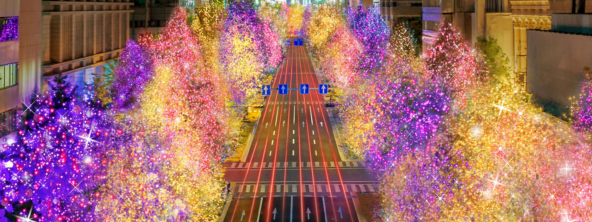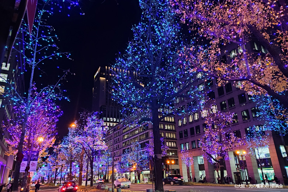 大阪のメインストリート・御堂筋が、梅田から難波まで鮮やかなイルミネーションで煌めきます。