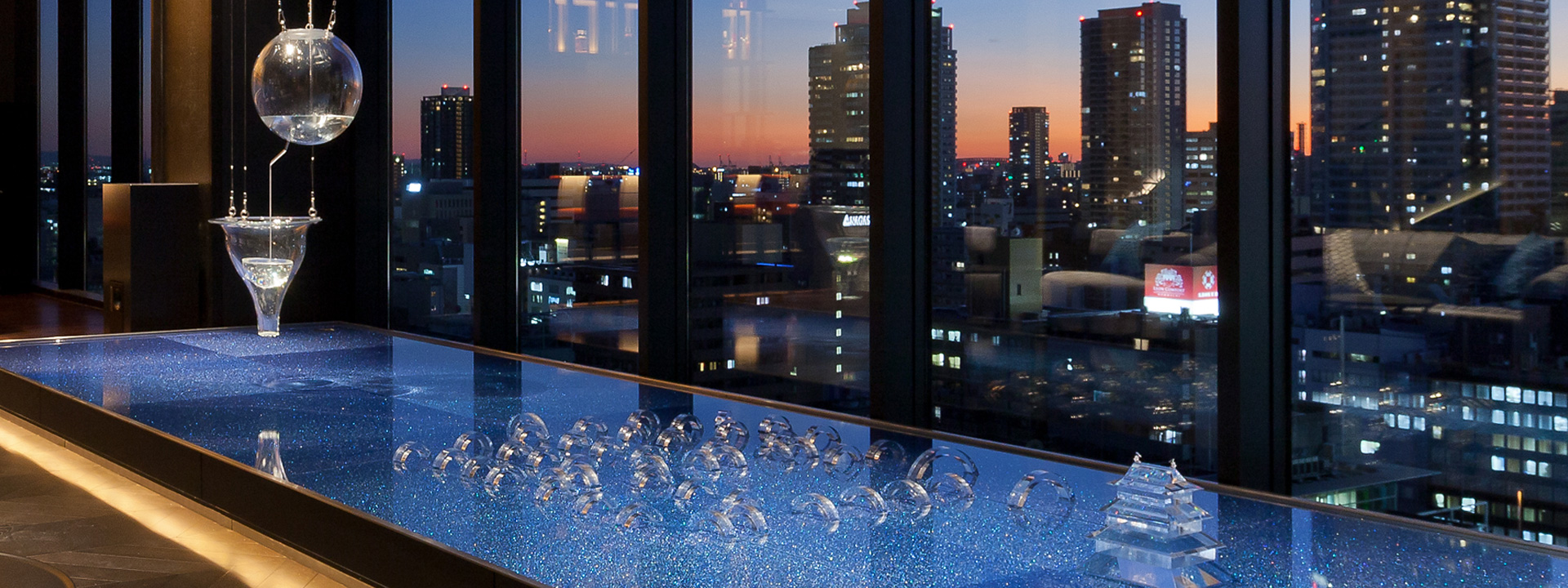 水都・大阪をイメージした水盤や、職人技が光る天満切子のペンダントライトが織りなす