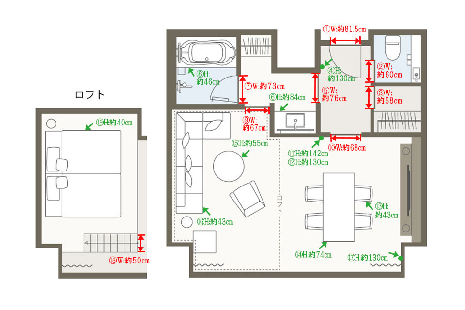 お部屋の間取りはあくまで一例です。面積や家具の配置、備品などはお部屋により異なりますので、あらかじめご了承ください。