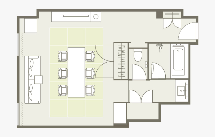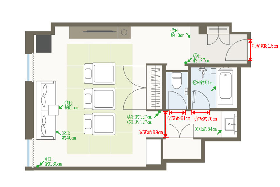 お部屋の間取りはあくまで一例です。面積や家具の配置、備品などはお部屋により異なりますので、あらかじめご了承ください。