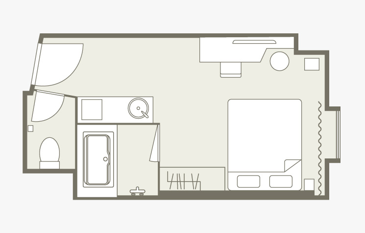 お部屋の間取りはあくまで一例です。面積や家具の配置、備品などはお部屋により異なりますので、あらかじめご了承ください。