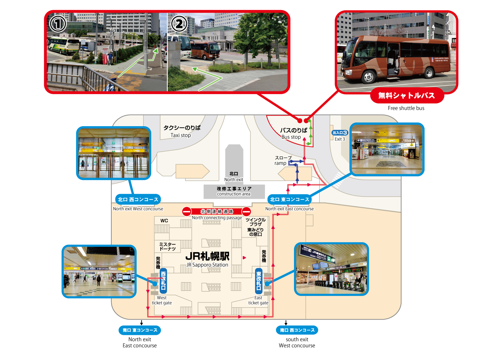 | 【ご利用に際して】 ●ご乗車は当ホテルをご利用のお客様のみ無料にてご利用頂けます。 ●中型(定員18名)での運行となりますが、新型コロナウィルス感染症対策の一環として当面の間14名定員で運行致します。 定員に達した場合はご乗車いただけない場合がございます、予めご了承ください。 ●ホテルから札幌駅北口行きのシャトルバスをご利用の場合は事前予約制とさせて頂きます。ご利用のお客様はフロント係までお申し付け下さい。 ●上記以外での場所での乗降、および途中下車は出来ません。 ●気候・路面状況により発車・到着時刻が遅れる場合がございます。 ●車両の整備点検、不測の事態により代車での運行となる場合がございます、予めご了承下さい。 ●上記の運行時間および運行経路を変更させていただく場合がございます、予めご了承ください。 |
