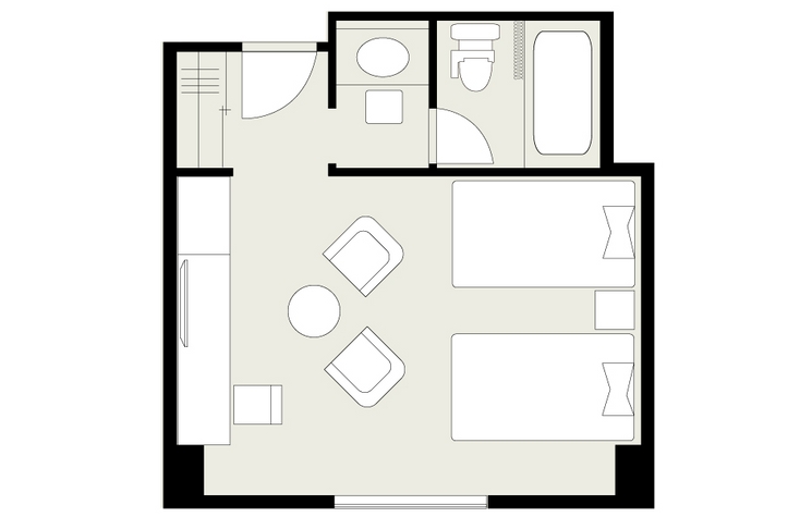 お部屋の間取りはあくまで一例です。面積や家具の配置、備品などはお部屋により異なりますので、あらかじめご了承ください。