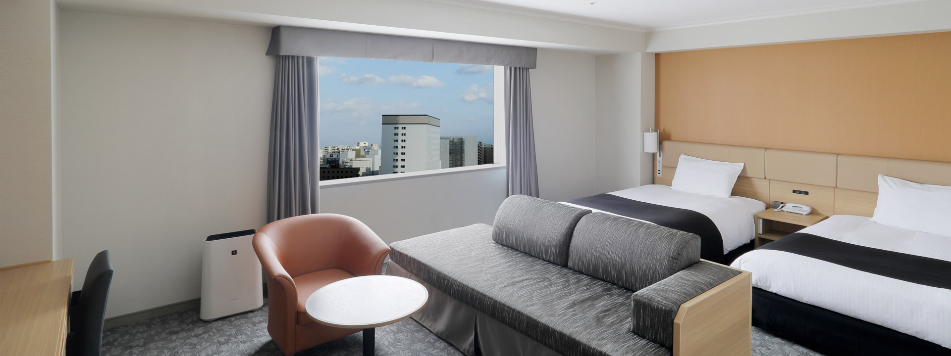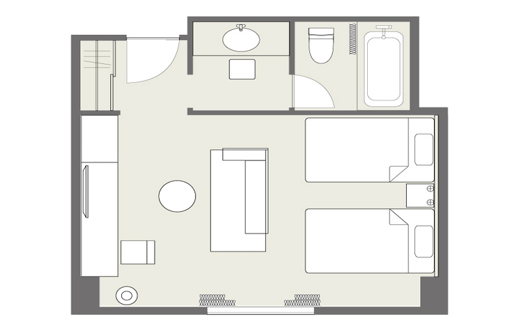 お部屋の間取りはあくまで一例です。面積や家具の配置、備品などはお部屋により異なりますので、あらかじめご了承ください。