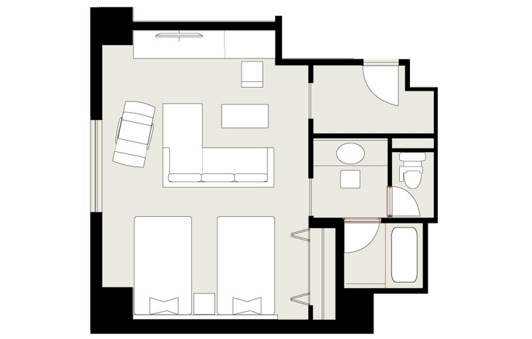 お部屋の間取りはあくまで一例です。面積や家具の配置、備品などはお部屋により異なりますので、あらかじめご了承ください。