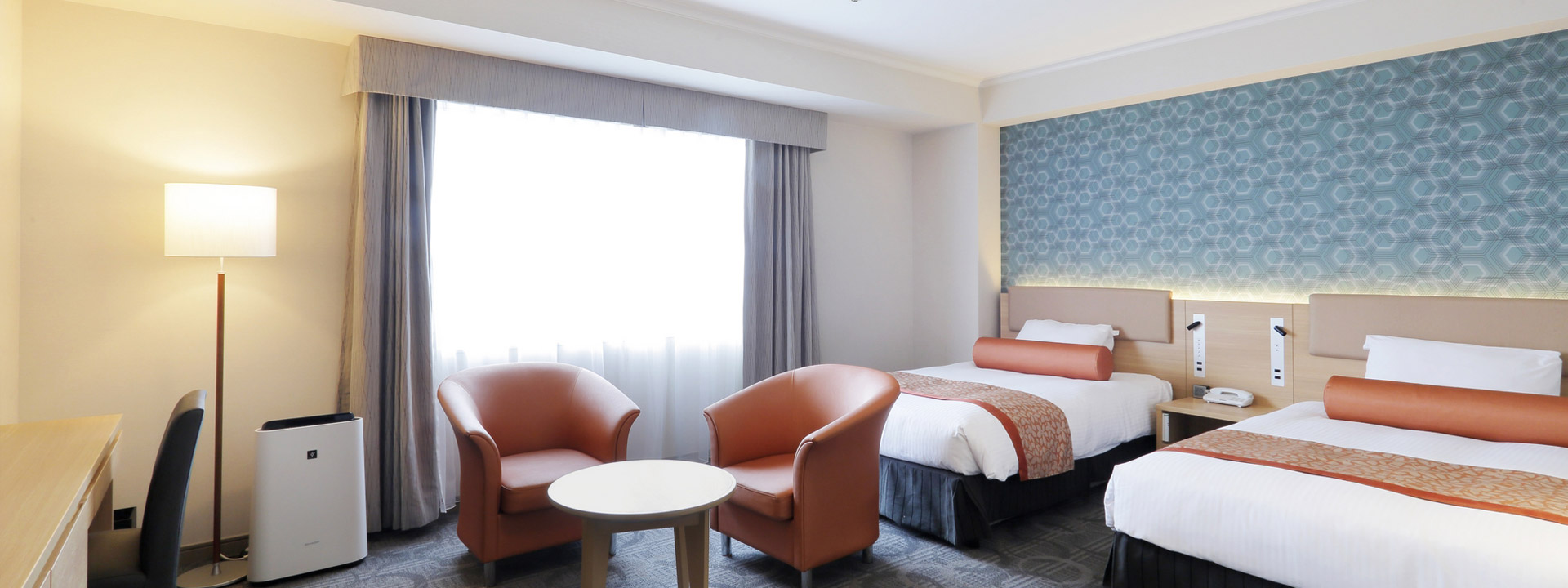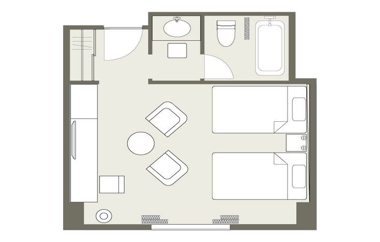 お部屋の間取りはあくまで一例です。面積や家具の配置、備品などはお部屋により異なりますので、あらかじめご了承ください。