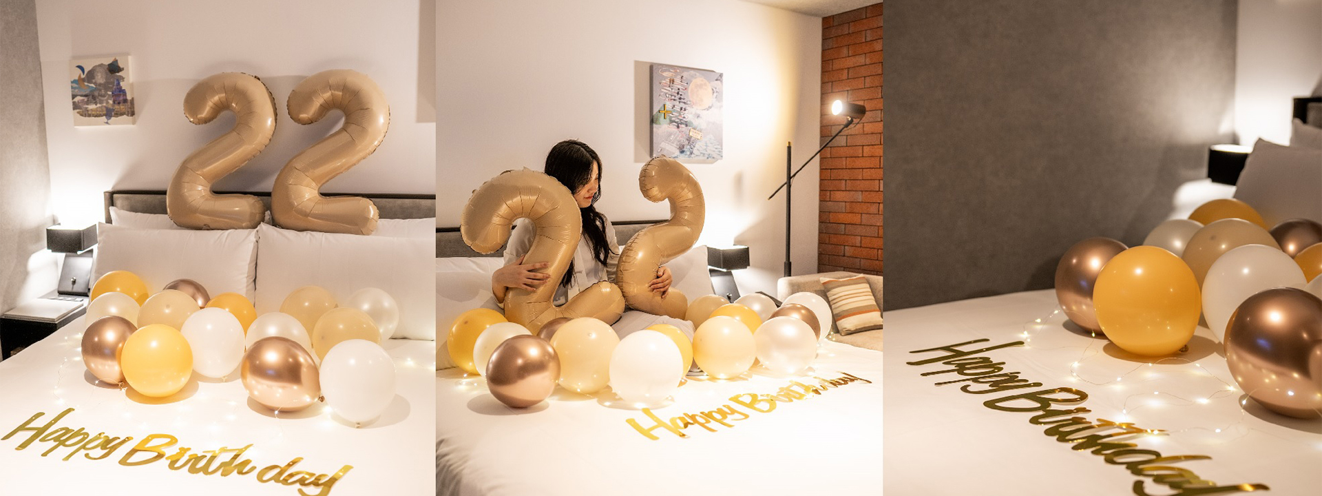 お部屋に⾜を踏み⼊れた瞬間、⽬に⾶び込んでくるのは、⼤きなナンバーバルーン。ベッド上のアニバーサリーバナーは、特別な日を祝福するための一言。夢のような空間がお部屋全体に広がります。ご家族・ご友人・パートナーとの最高の思い出にご利用ください。