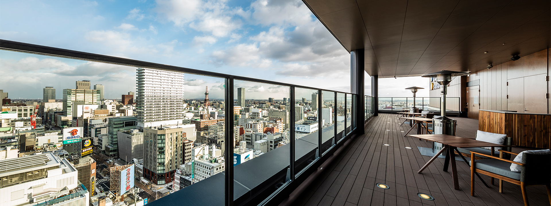 地上約78メートル、ホテル最上階で四季の風を感じられます。空間を贅沢に使ったこの場所からは、さっぽろの街並みは勿論、晴れの日は遠く石狩湾まで望めます。この空間を活かしたイベントなども定期的に開催を予定。宿泊のお客さまはご自由に利用いただけます。