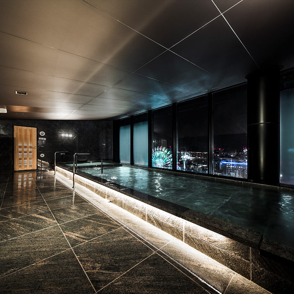 昼と夜、表情の異なる街の眺望がこの上ない、オープンラウンジとスパ。ひのきが香る本格フィンランド式サウナで、ロウリュ体験も。