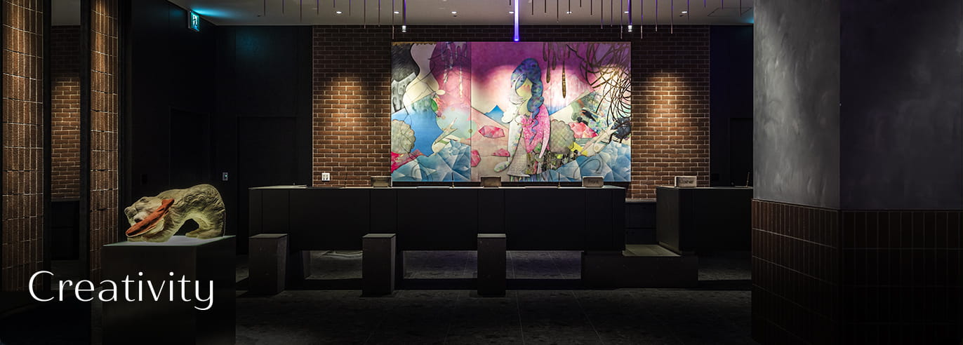 インテリア、アートなど、ホテル内はすみずみまでデザインのこだわりを感じられる。地域らしさとクリエイティブが混ざり合う空間が、旅の感性を刺激する。