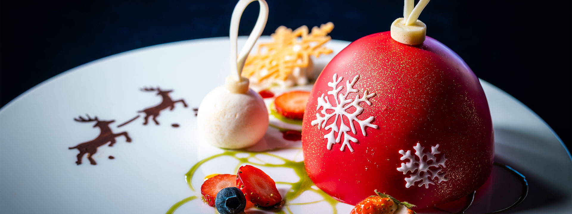 前菜には希少な国産ブランド豚「十勝ロイヤルマンガリッツァ豚」のパンチェッタを使用。とろける脂の甘みと芳醇な香りが、コース全体に深みを添えます。さらに、温かいパテと仔牛タンのコンフィには、赤ワインや果実を煮詰めた滑らかな「ルージュのクーリ」を添え、味わいに豊かな奥行きをプラスしました。締めくくりには、ホテルパティシエ特製のクリスマスデザートをご用意。赤い鈴をかたどったチョコレートの中に、ふわりと軽やかなクレームダンジュを閉じ込めた、見た目と味わいの両方で魅了する一皿です。イチゴの華やかな香りとミルキーなコクが、大人のクリスマスにふさわしい余韻をもたらします。