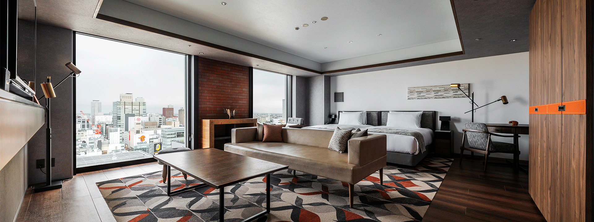 ラベンダー畑や雪の結晶を想起させるカーペット、北海道開拓の象徴でもあるレンガ壁がアクセントの部屋