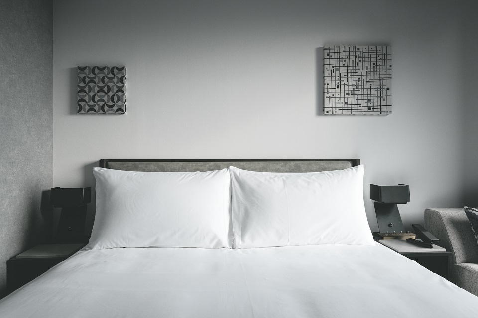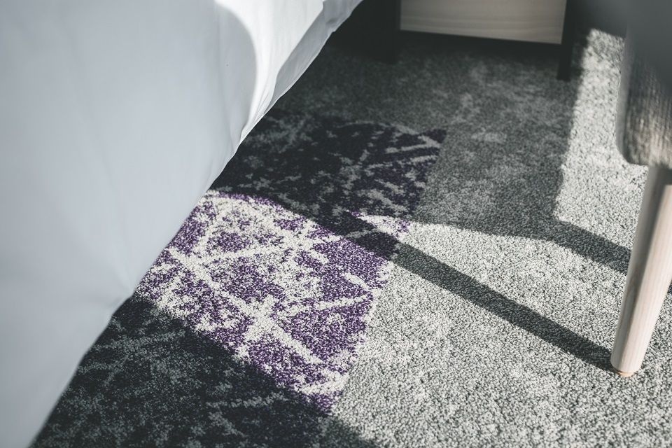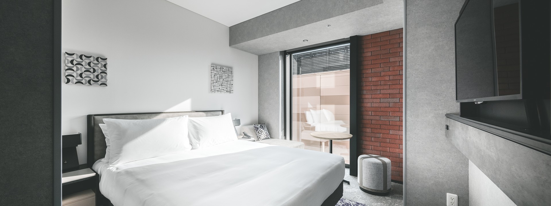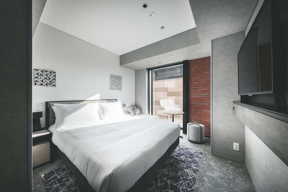 ラベンダー畑や雪の結晶を想起させるカーペット、北海道開拓の象徴でもあるレンガ壁がアクセントのお部屋。壁のアートは札幌で有名な名所をモチーフに描いています。街で探してみては。