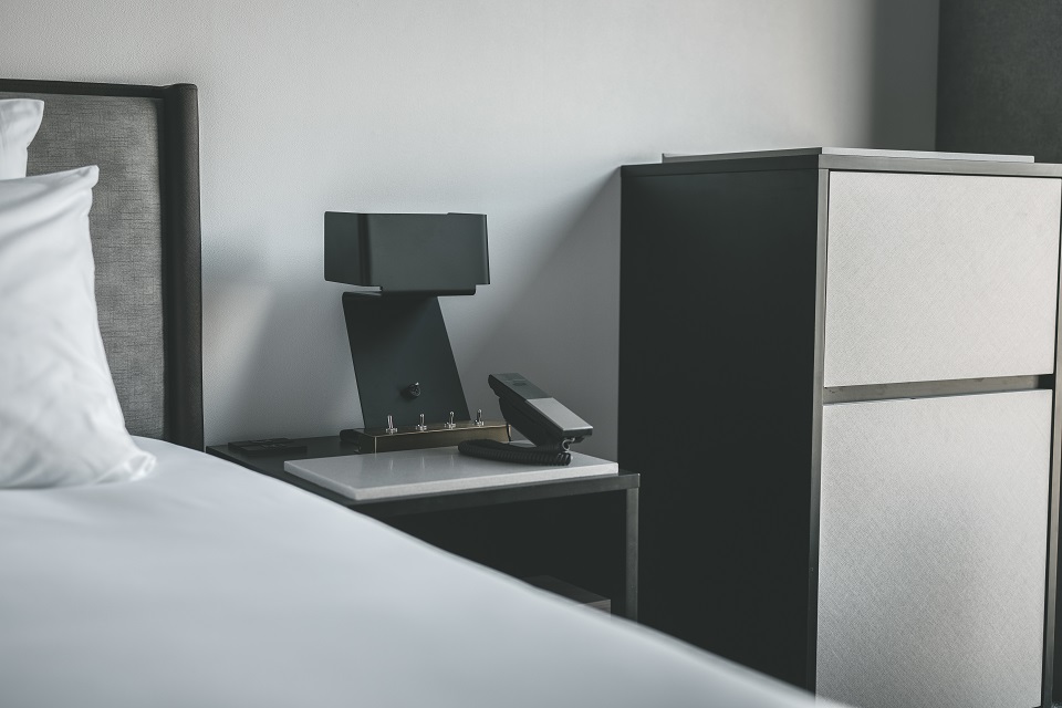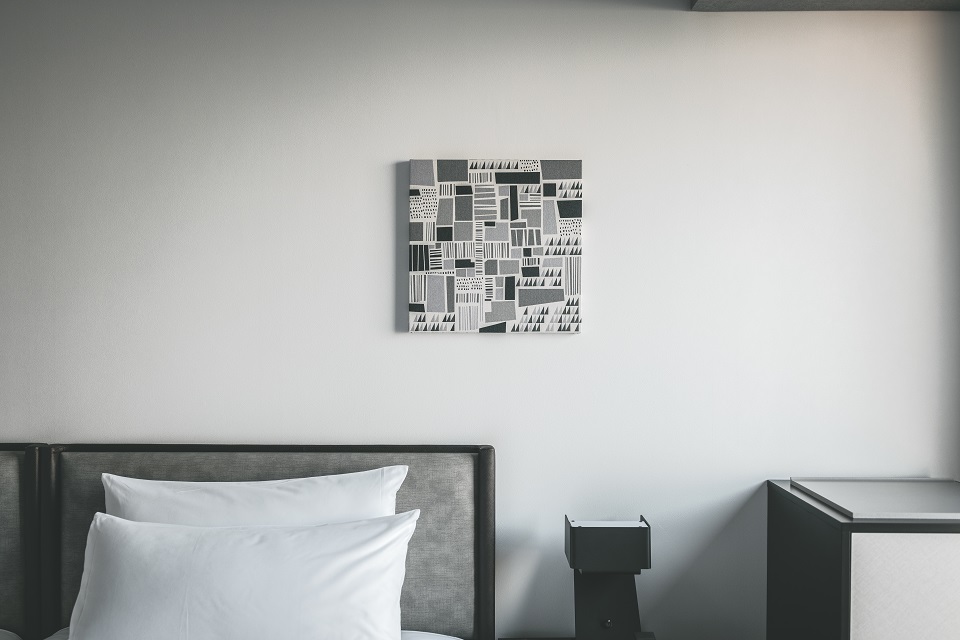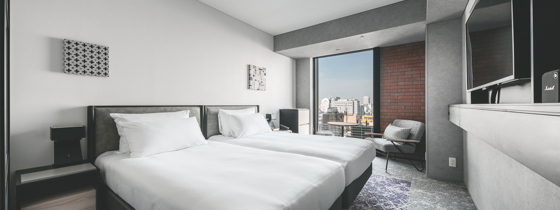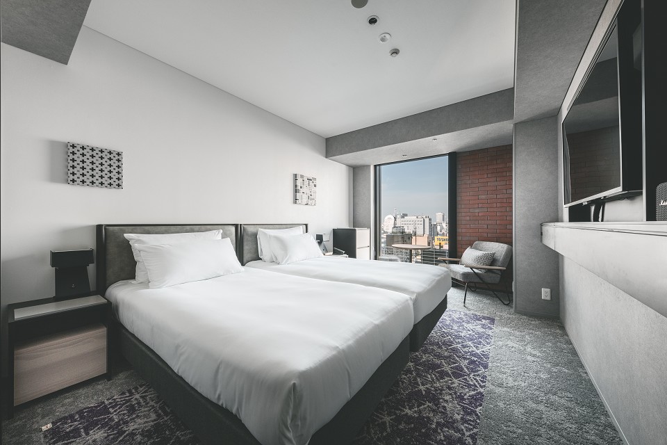 お二人でもゆったりと過ごせるミニマルルーム。温かみを感じる手触りのよい木製テーブル・チェアは、健やかな白木で統一され、交差点に面する立地にちなむ+モチーフが特徴のシンプルなお部屋です。