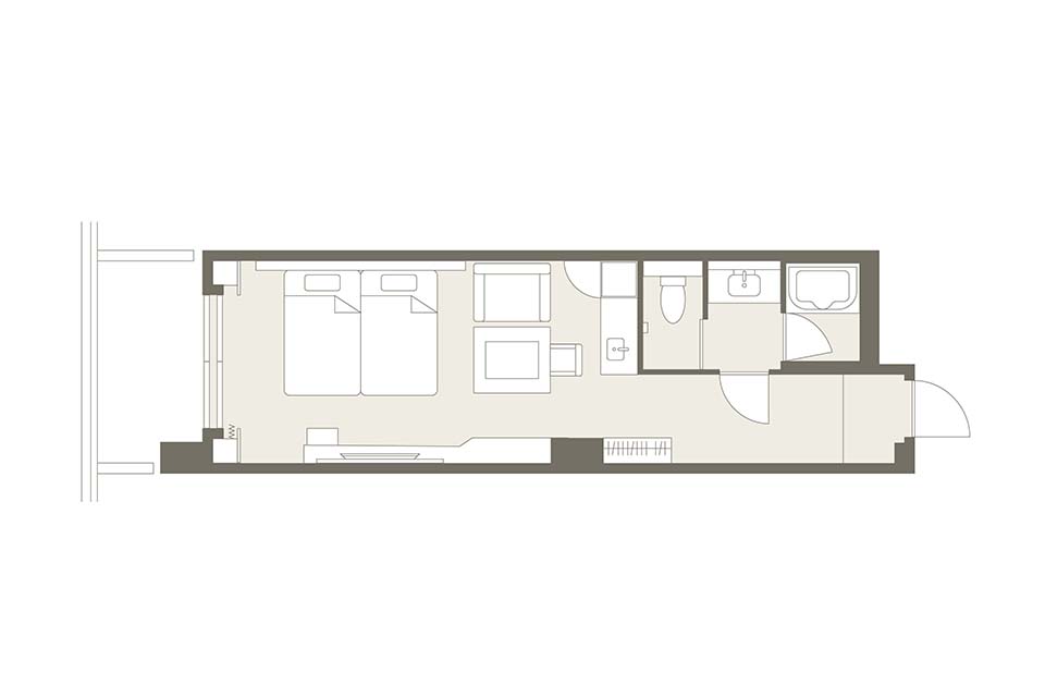 お部屋の間取りはあくまで一例です。面積や家具の配置、備品などはお部屋により異なりますので、あらかじめご了承ください。