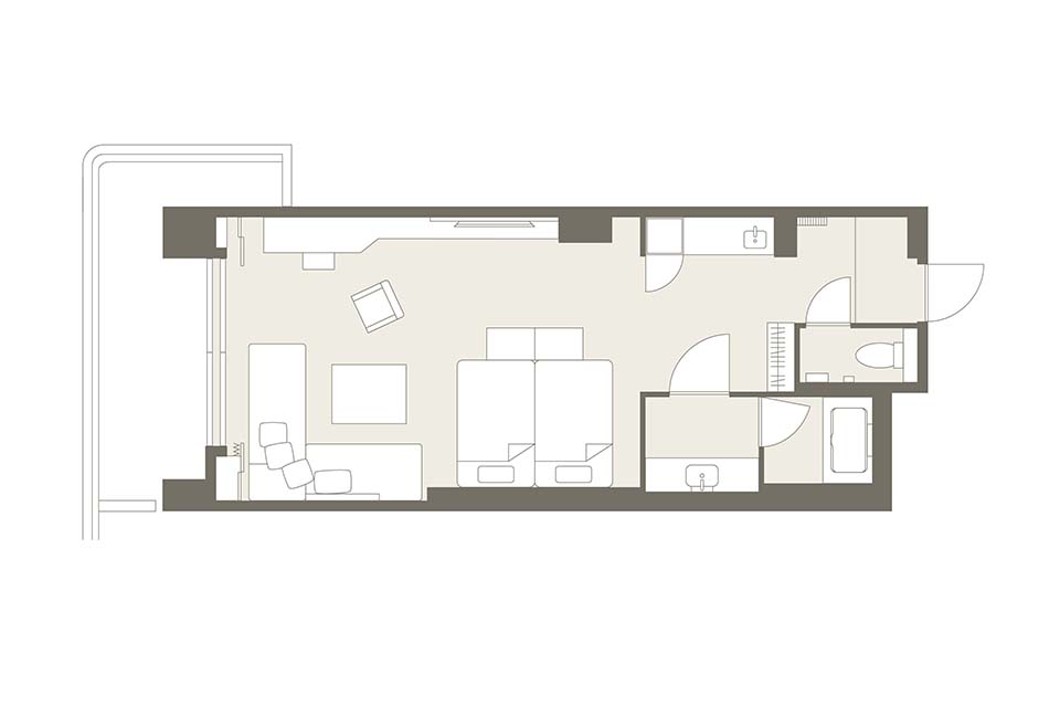 お部屋の間取りはあくまで一例です。面積や家具の配置、備品などはお部屋により異なりますので、あらかじめご了承ください。