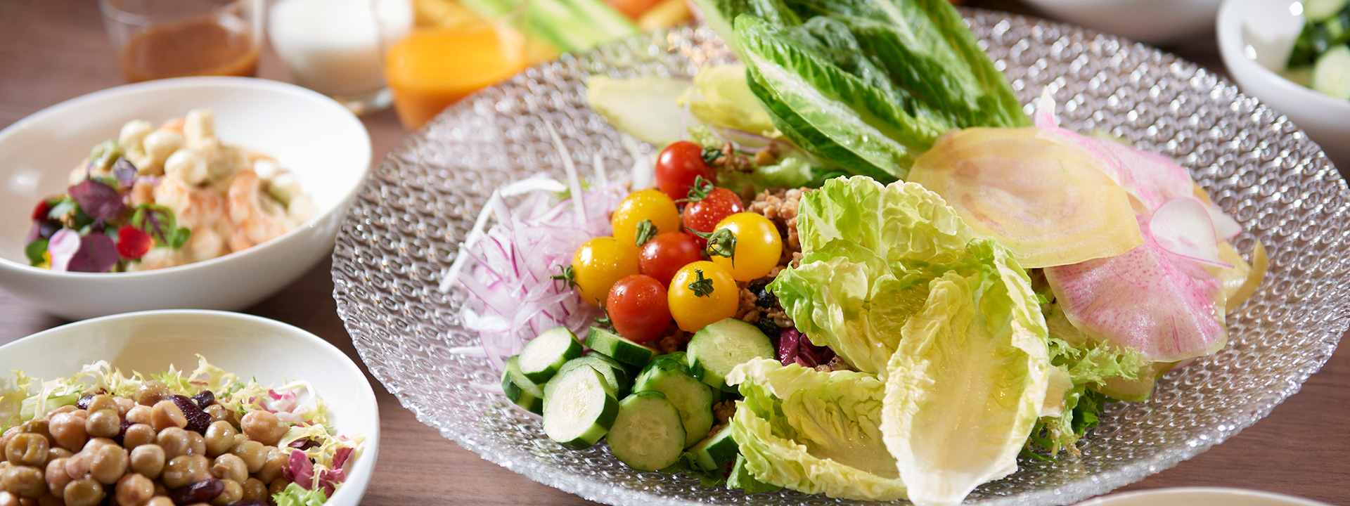 ブッフェ朝食の豊富なメニュー。地上100メートルの絶景が臨めるレストラン「ア ビエント」にてごゆっくりお楽しみください。