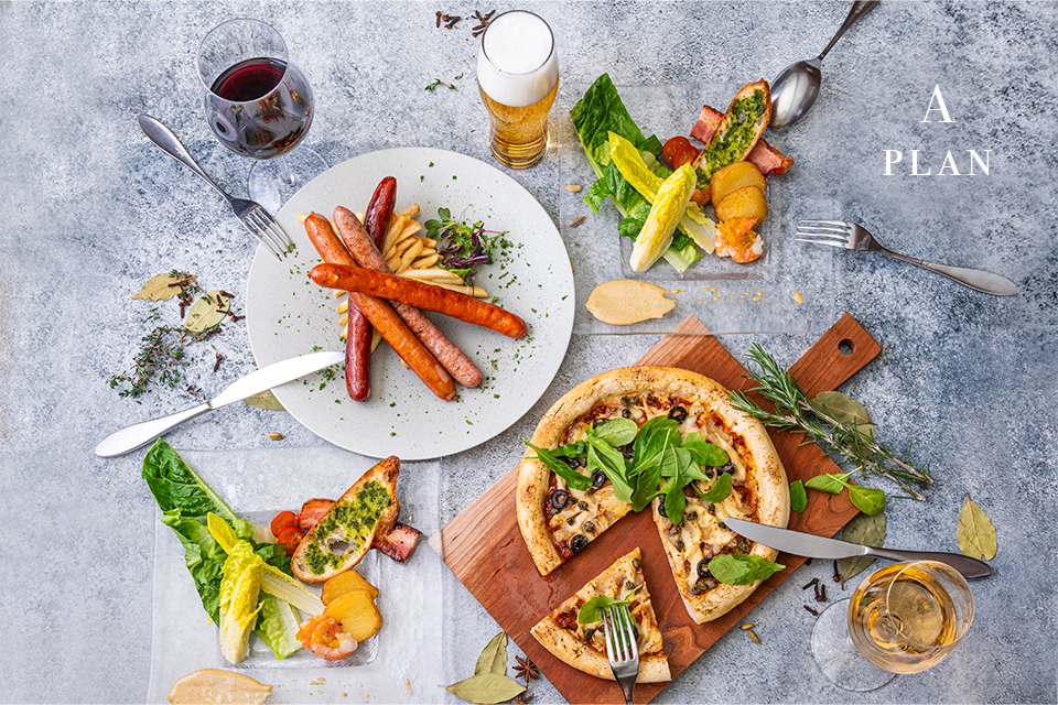 飲み放題 +「サラダ、ソーセージ盛り合わせ、ピザ」