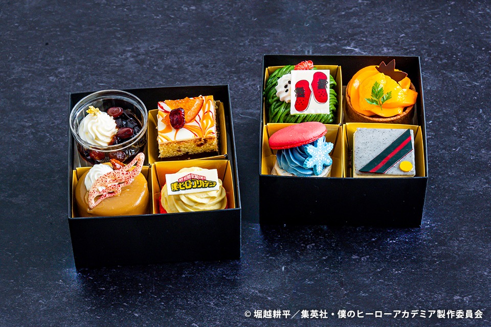 ホテルパティシエが、アニメ「僕のヒーローアカデミア」のキャラクターや世界観をイメージした手作りのスイーツを2段のボックスに盛り込みました♪