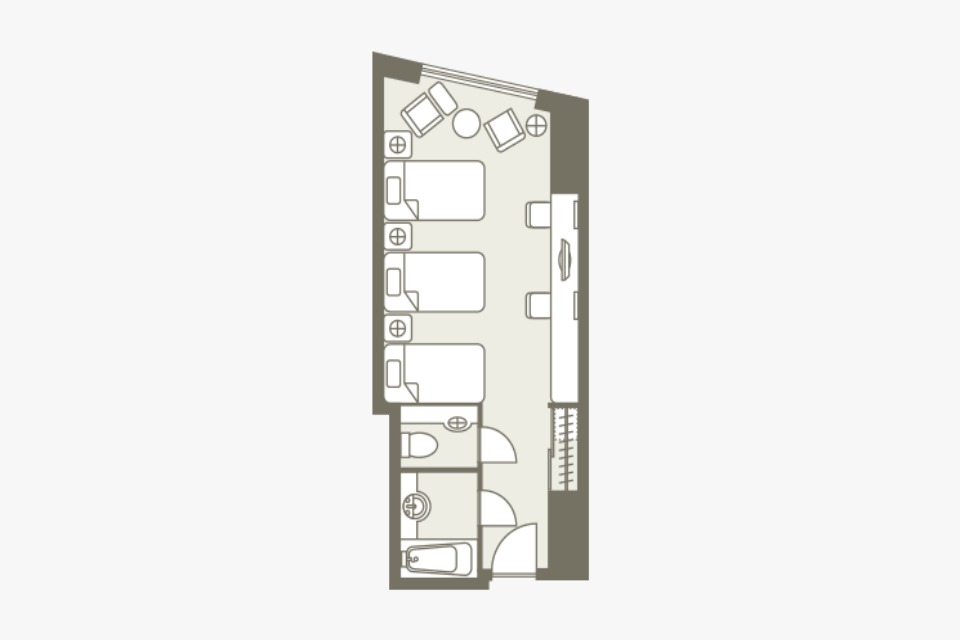 お部屋の間取りはあくまで一例です。面積や家具の配置、備品などはお部屋により異なりますので、あらかじめご了承ください。
