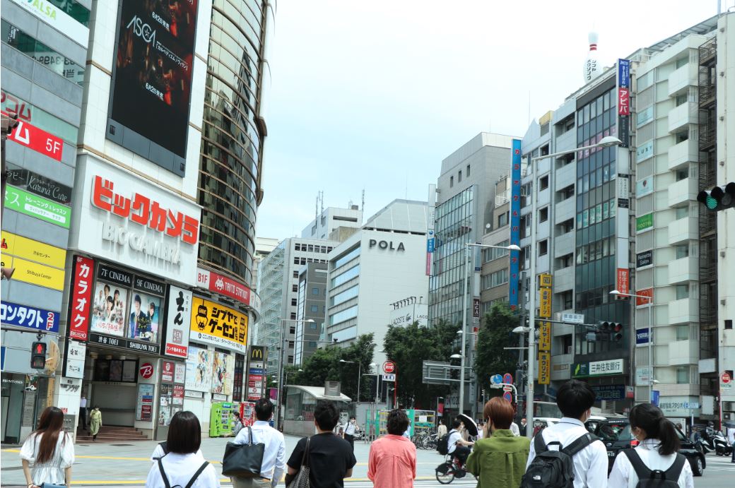 ③「宮益坂下」交差点に着きましたら、斜め向かい側にあります「ビックカメラ」の方面へお進みください。