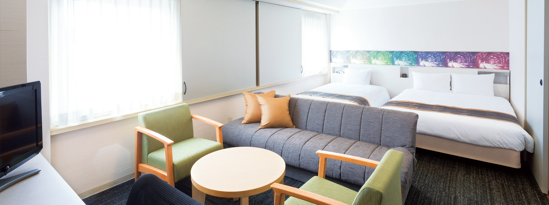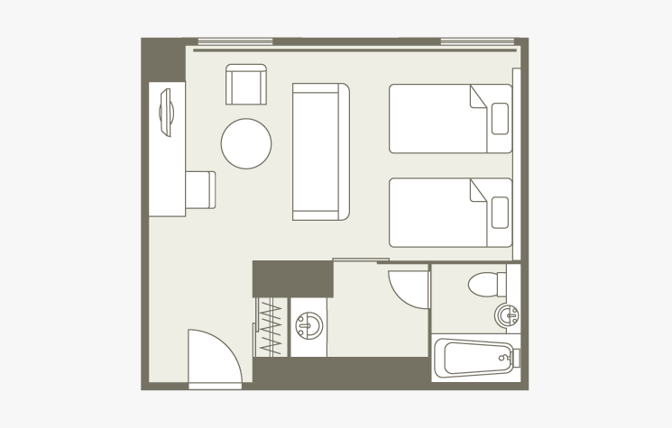 お部屋の間取りはあくまで一例です。面積や家具の配置、備品などはお部屋により異なりますので、あらかじめご了承ください。