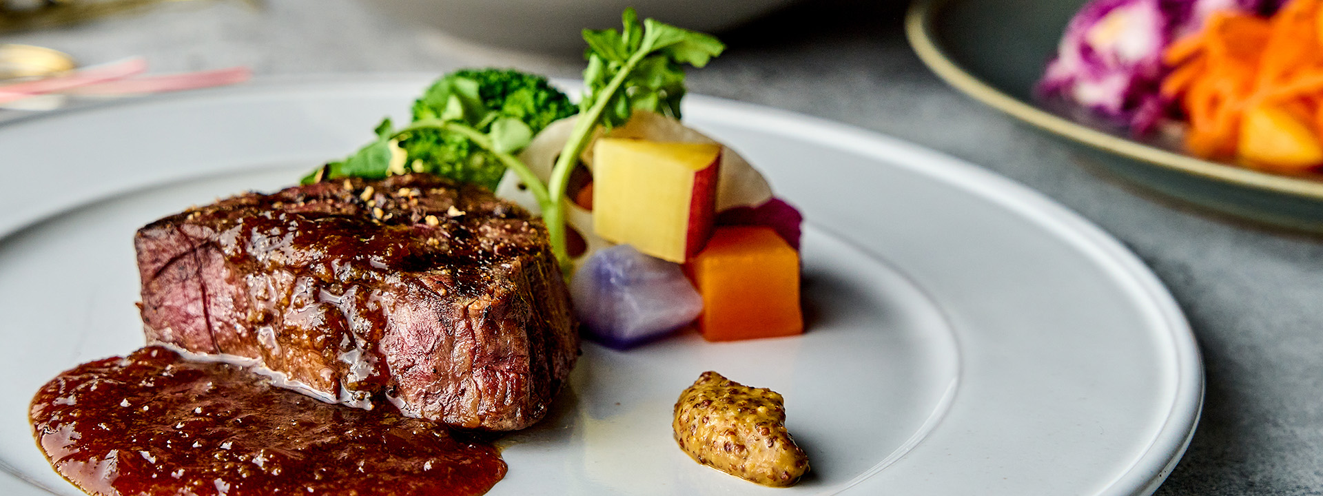 国産牛サーロインまたはヒレから選べるメインディッシュの全4品のスペシャルディナーセットです。数種類のサラダが楽しめるデリサラダとスープ、デザートとボリュームもあるので、お腹も心も満たされること間違いなし!