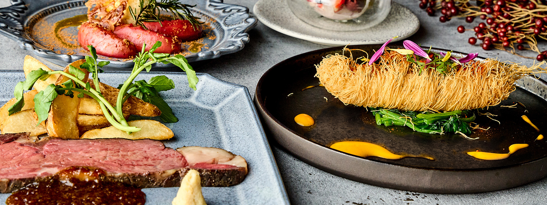 国産牛サーロインのローストが堪能できる全6品コースです。鮪とビーツのタルタルなど見た目にも華やかな前菜はもちろん、カダイフの香ばしいパリパリ食感とともに楽しめる真鯛はスタッフのイチオシです。