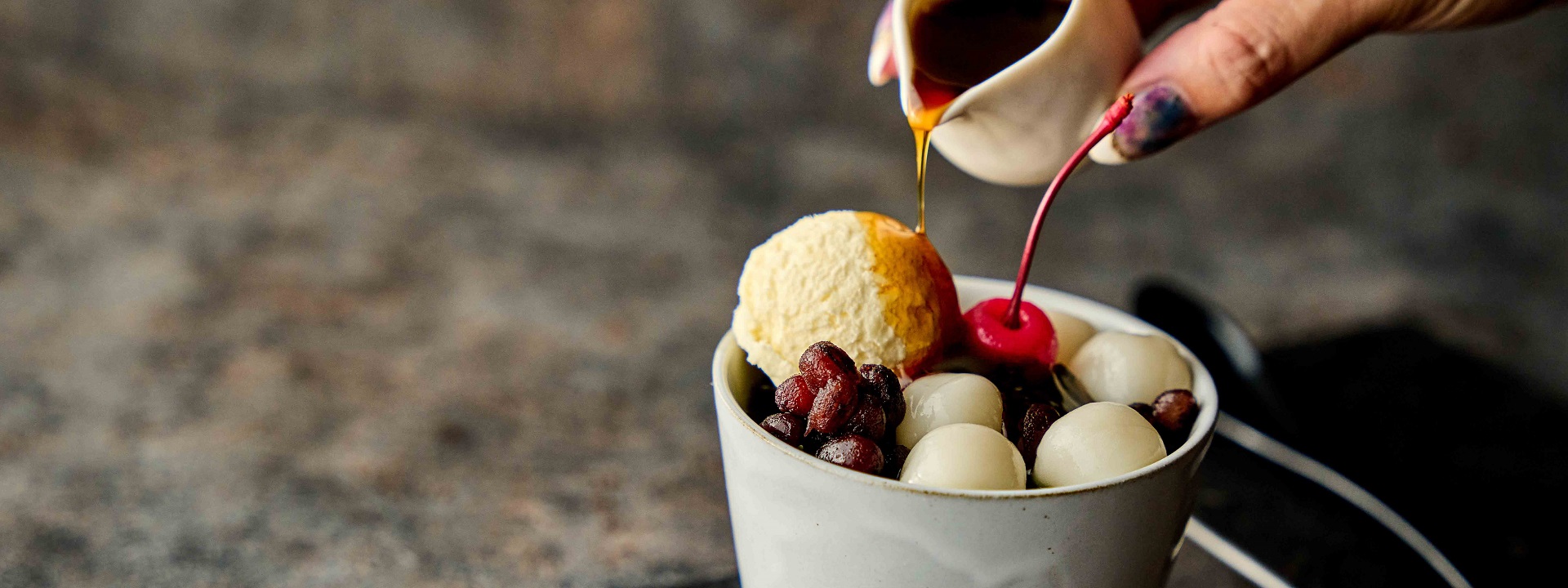 抹茶ソースとバニラアイスが、コクのある味わいに仕上げます。