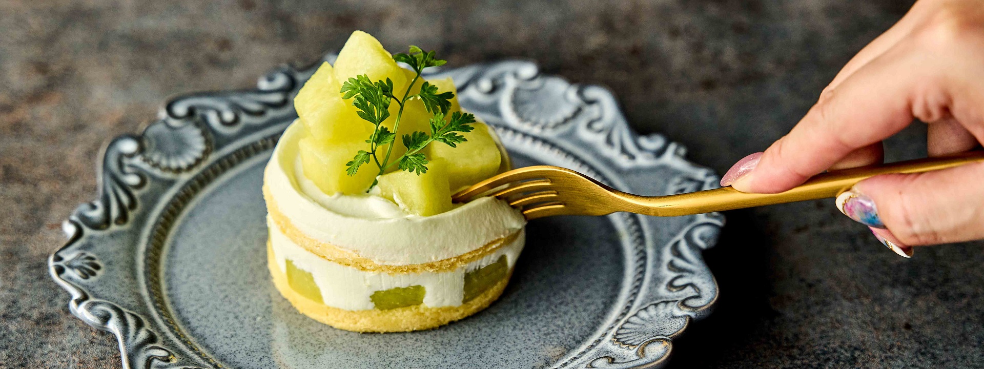 とろける甘さのマスクメロンをたっぷり使用したショートケーキ。みずみずしい果実と軽やかなクリームが重なり合う、初夏のご褒美ショートケーキです。