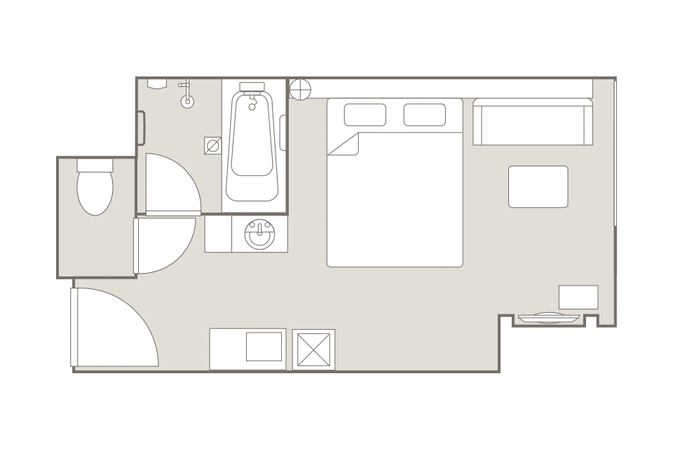 お部屋の間取りはあくまで一例です。面積や家具の配置、備品などはお部屋により異なりますので、あらかじめご了承ください。